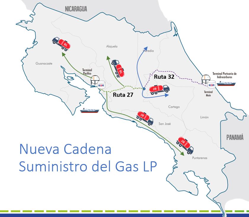 Continuar la concentración de inventarios en la provincia de Limón no soluciona el problema que presenta el Gas LP en su cadena de suministro, ya que es un producto con alto riesgo de desabastecimiento, debido a la vulnerabilidad de la sistema de distribución final, esto por cuanto el abastecimiento del 100% de la demanda se realiza a través de camiones cisternas desde la Terminal de Moín, resultando que el total del suministro del Valle Central, Zona Norte y Zona Pacífico debe atravesar la Ruta 32, la cual cuenta con una alta siniestralidad y afectación por derrumbes y mal tiempo, lo que conlleva a que la cadena de distribución se vea detenida de manera recurrente y que diariamente camiones cisternas recorran nuestras carreteras, cuando se puede proveer una solución que implica un ahorro de al menos 700 mil km de recorrido para dichos vehículos, implicando un ahorro anual de 8 millones de dólares en costos de transporte terrestre.